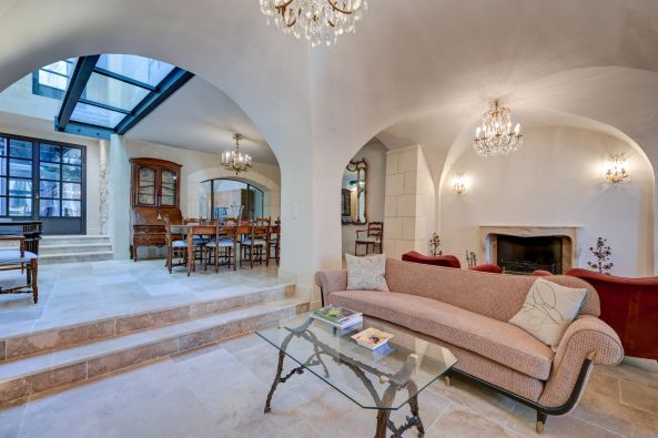 The reception areas offer a warm and elegant ambiance, featuring a character-filled living room and a vaulted kitchen, both opening directly onto the inner courtyard and creating a natural flow between indoor and outdoor living spaces.
