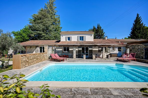 Maison avec piscine à 15mn à pied du centre de Saint Rémy de Provencedeally located just a 3-minute drive from the town center (15-minute walk), this charming house enjoys a peaceful, green setting. Set on 1000m² of land with a swimming pool, it offers a beautiful living space of approximately 150m². The ground floor comprises an entrance hall, a spacious living room with an open-plan kitchen and dining area of over 40m² opening onto a south-facing terrace, a lounge, and an office area. The house also features three large bedrooms, including a master suite on the ground floor, as well as a separate, fully equipped studio. A perfectly maintained, comfortable, and ideally located home, perfect as either a primary or secondary residence. Energy and climate performance